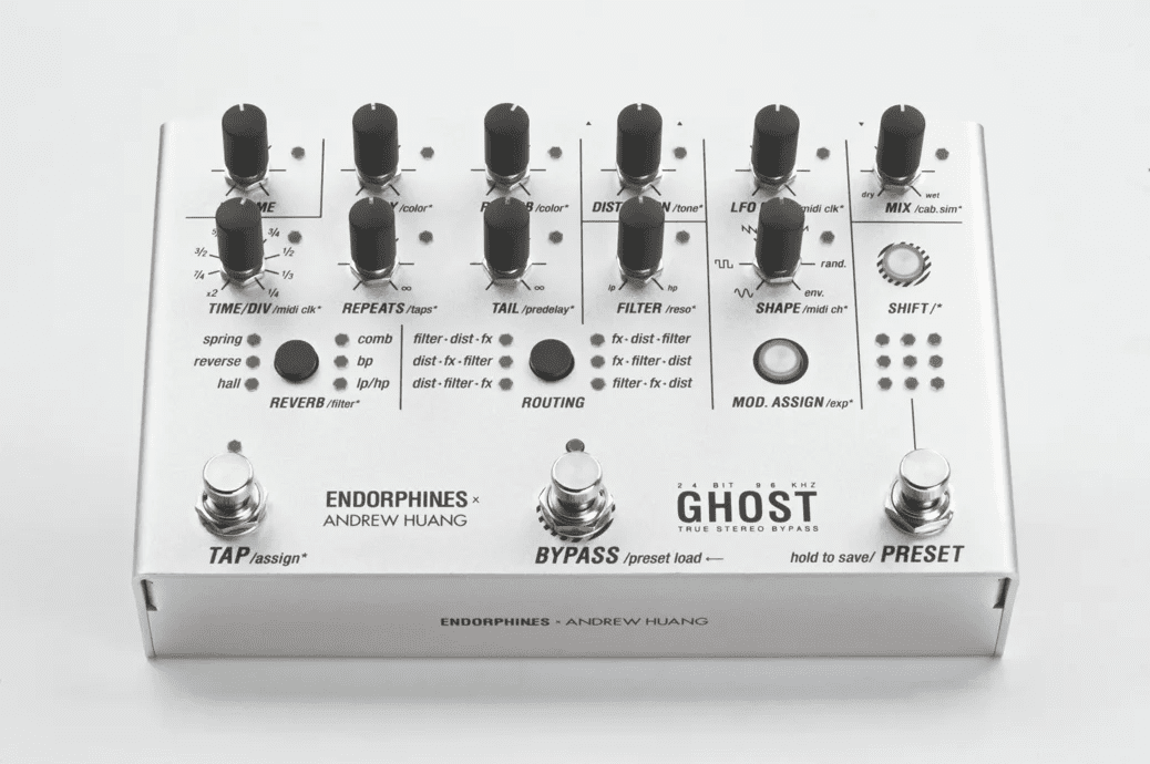 The Ghost Pedal, which is suitable for both live performance and studio work, goes well beyond what is possible with traditional pedals and stomp boxes. Developed in combination with producer Andrew Huang, the Ghost Pedal allows users to change tonal response or signal chain routing of any signal — from an overdriven electric guitar to a droning synth voice — at the press of a button.